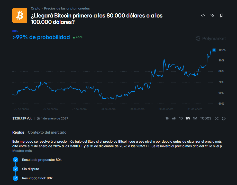 La expectativa sobre el precio de bitcoin (BTC) ha encontrado un nuevo punto de referencia en los mercados de predicción. Actualmente, la plataforma Polymarket otorga una probabilidad del 83% a que la moneda digital alcance la marca de los 80.000 dólares antes de que finalice el presente año.